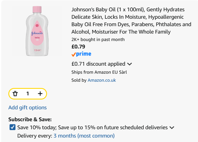 Now this is a bargain to keep in your make up bag, or your nappy bag! I swear by Johnson's Baby Oil for removing my eye make up so I had to snap up this bargain from Amazon. You can get the Johnson's Baby Oil 100ml for only 79p right now when you subscribe and save and tick the 50p off voucher. Making it the cheapest price around right now, it's normally £1.50.