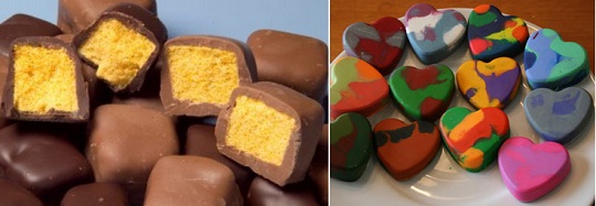 If you're looking for ideas for gifts to put in the card you could make your own sweets - I wrote about that here- or heart shaped crayons - I made some following this feature here (scroll down the page). I would suggest that you lightly oil the moulds, and as others have said online, I too have found that crayola works best. I've bought animal shaped moulds too and for little gifts have made animal crayons. I want to do something pirate themed so please let me know if you find any pirate themed moulds!