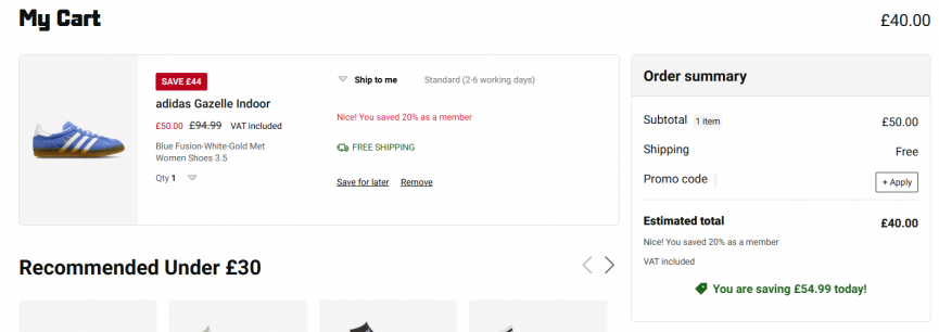 It even works on items that are already reduced like these adidas Gazelle Indoor Womens Shoes* which were originally £94.99 and went down to £50 in the sale. However when you're logged in you get the extra 20% off which makes them only £40!