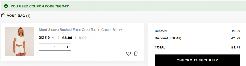 TheSale section here* is where you can really save a bundle! Items are already heavily reduced but you can also use the 43% off code. For example this Short Sleeve Ruched Front Crop Top* was originally £19 but is just £3 in the sale. However with the code it is only £1.71!