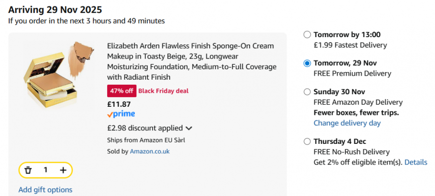 I've not tried the Elizabeth Arden Flawless Finish Perfect Foundation before but at this price it has got to worth a try! We've found this popular foundation from just £11.87 an an Amazon Black Friday deal when you subscribe and save and tick the 10% off voucher. It's still selling for £24 at John Lewis and Partners so this is a bargain!