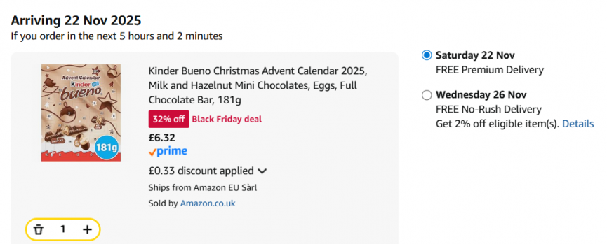 Oh yes, I have found my advent calendar! Not got yours yet? This Kinder Bueno Christmas Advent Calendar 2025 has dropped to £6.32 instead of £9.75, when you subscribe and save at Amazon. This is part of their Black Friday deals and so we expect it sell fast!