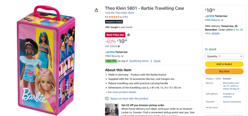 If your little one has lots of Barbies and accessories on their Christmas list this year then this Theo Klein Barbie Travelling Case is a great gift to add under the tree. It stores all their accessories and doll with ease and it currently has 60% off in the Amazon Black Friday deals! Get it for just £10.30 with free delivery for Amazon Prime members.