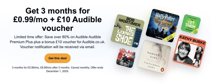 If you were thinking of getting Audible for audio books this is a fantastic offer from Amazon. You can get 3 months of Audible Premium Plus subscription for only 99p per month, it's normally £8.99 per month! Plus you also get a £10 Audible voucher too, this will be emailed to you once you are subscribed. Just follow the link below to sign up and take advantage of this offer.