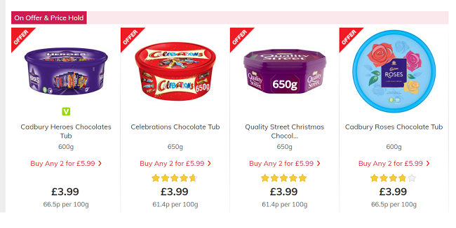 Tesco have brought back their 2 for £7 offer on Christmas chocolate sharing tubs*, and this time it includes Quality Street 650g, Cadbury Heroes 600g and Roses 600g. This is a Tesco Clubcard exclusive, so you need to use your card to get this offer. Offer runs until 1st December 2021.