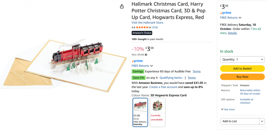 If you're looking for a special card for a Harry Potter fan this Christmas then we have found a beautiful 3D Hogwarts Express card that is perfect. The Hallmark Harry Potter Hogwarts Express 3D Christmas Card is down to just £3.08 at Amazon, it looks at least twice the price!