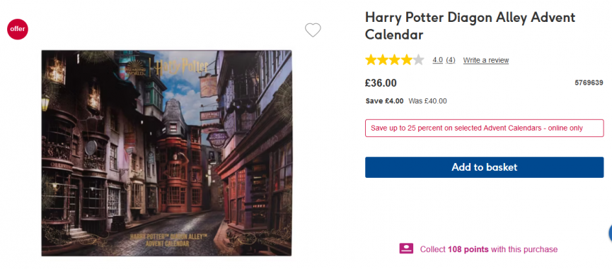 Harry Potter fans are going to want to get their hands on this amazing Harry Potter Diagon Alley Advent Calendar to help countdown to the festive season with! It currently has 10% off at Boots making it £36 instead of £40 and it is selling fast!