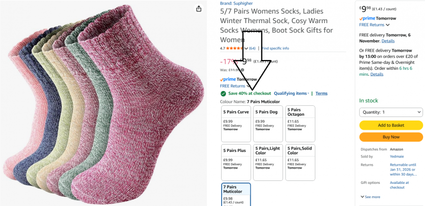 They are normally £9.98 but with the code they are just £5.99. There are other designs available and many of them have 40% off too. However this selection is currently the cheapest and for 7 pairs whereas the others have 5 pairs.