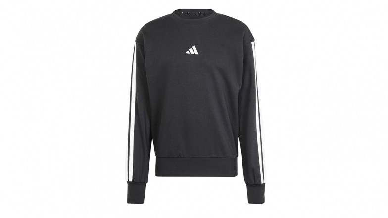 This is a regular fit, ribbed crewneck sweatshirt with a drop shoulder and ribbed cuffs and hem. It's just the black that's this cheap and it has the adidas logo on the chest and the three stripes in white running the full length of the sleeves.