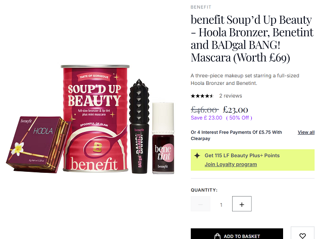 If you're a fan of Benefit cosmetics you'll not want to miss this bargain, as Look Fantastic have this Benefit Soup’d Up Beauty Bronzer, Lip & Cheek tint, & Mascara Trio for half price in their sale! Grab it for just £23 down from £46 before it goes!