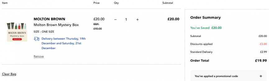 Home delivery is £2.99 so the total is £19.99 delivered for this Molton Brown gift set. Home delivery is free when you spend £50.