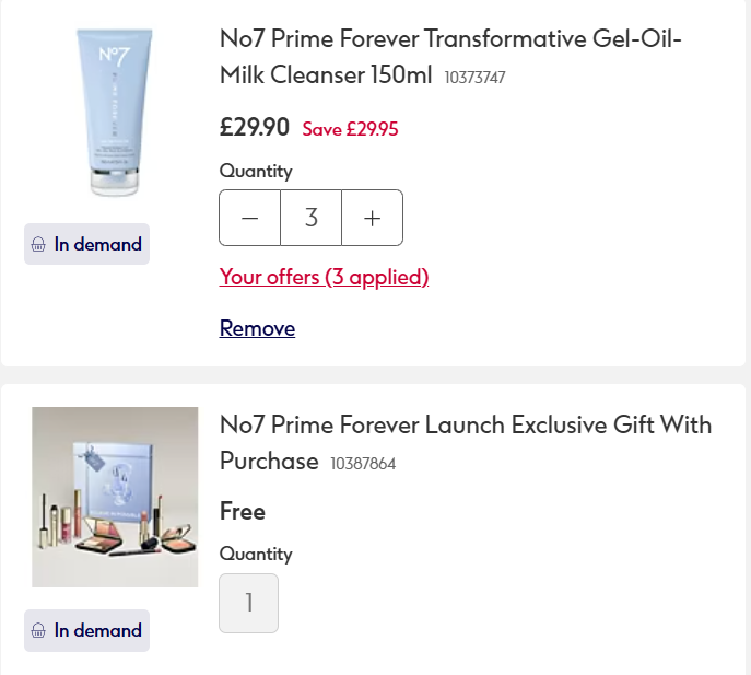 For example I added 3 of the new No7 Prime Forever Transformative Gel-Oil-Milk Cleanser 150ml* to my basket. The 3 for 2 applied automatically, I then added the code NO7SAVE10 at the checkout and it took another £10 off. This works on all of the items in the offer but this is the cheapest product in stock.