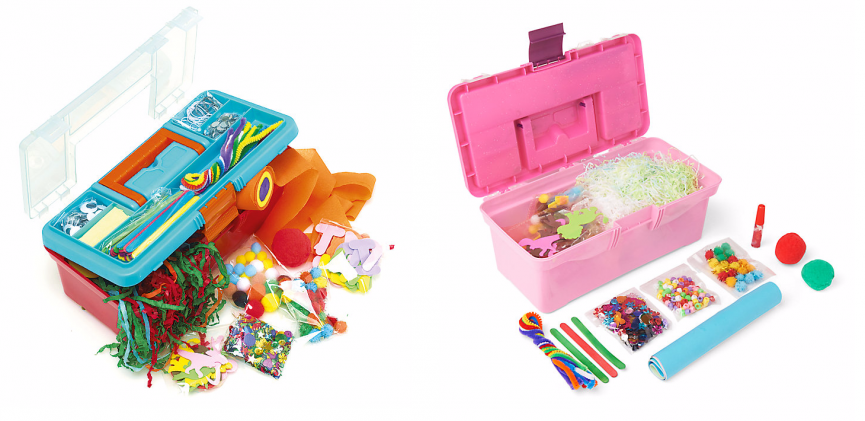 These are large plastic toolboxes perfect for storing all your craft supplies, and they com filled with an assortment of bits and bobs to get your kids started.