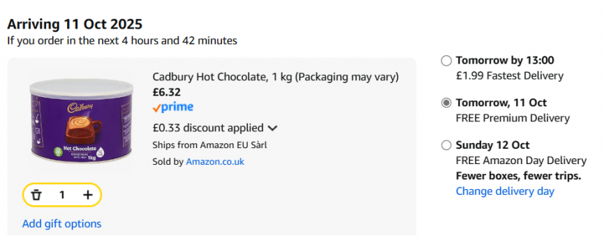 This huge tin of Cadbury Hot Chocolate is normally £9+ however with subscribe and save the price is just £6.32. That's the cheapest price we've found it for right now.