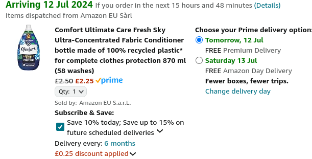 - Click here for Comfort Pure Ultimate Fresh & Mild Ultra-Concentrated Fabric Conditioner 58 Wash @ Amazon* (save £2.50 at checkout)