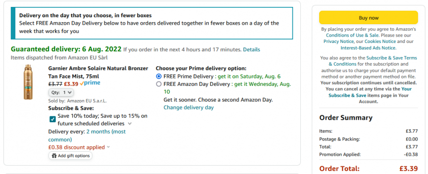The Garnier Ambre Solaire Self-Tan Face Mist sells for around £6 elsewhere but if you opt to Subscribe and Save and tick the 5% off voucher that is underneath the price then you end up paying just £3.39.