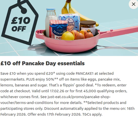 If you have a Co-op, Sainsbury's, Morrisons, Waitrose, Iceland, Asda or One Stop near you on Just Eat then this is a deal you won't want to miss. You can currently get £10 off a £20 spend at any of these stores online! Just use the discount code PANCAKE1 at the checkout, today only!
