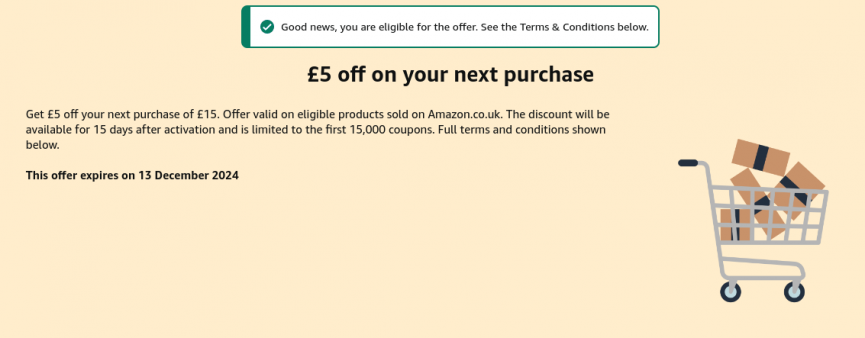 This offer is for selected customers only, the discount will be available for 15 days after activation and is available for the first 15,000 eligible customers only. Valid on items sold and dispatched by Amazon only.