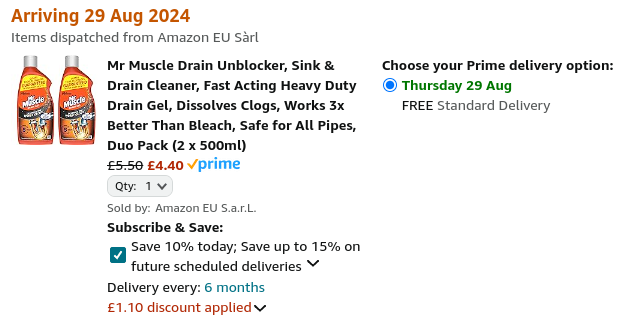 It always helps to save money on essentials and this Mr Muscle Drain Unblocker, Sink & Drain Cleaner Duo Pack (2 x 500ml) is a great buy at Amazon. Grab it for just £4.40 when you Subscribe and Save and tick the 10% off voucher.