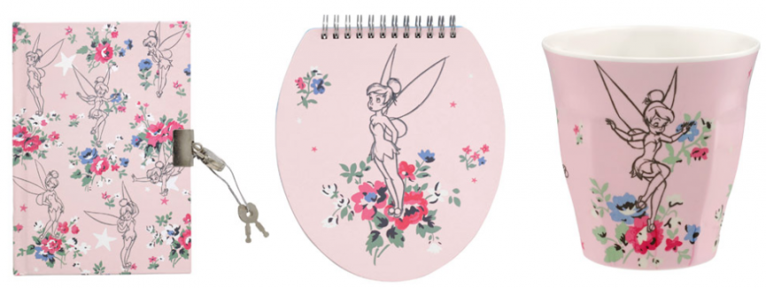 Midnight A4 Notebook £14, Tinkerbell Ceramic Travel Cup £16, Tinkerbell Posy Cushion £25, Tinkerbell Hard Cover Notebook £10, Midnight Collectors Bauble £10, Tinkerbell Foldaway Shopper £10