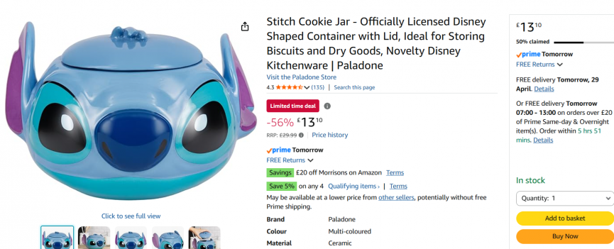 If you know a serious Disney fan this could make an amazing gift for them, as we have found this Stitch Shaped Cookie Jar reduced to just £13.10 on a limited time deal at Amazon, down from £29.99. Move fast as it is a limited time deal, the price may change at any moment.