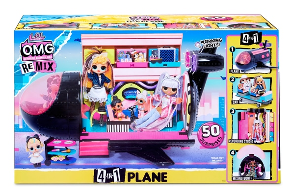 Travel in style in the L.O.L. Surprise! O.M.G. Remix 4-in-1 Plane. This transforming playset is 4-in-1, it is a Plane, Car, Recording Studio and Mixing Booth.