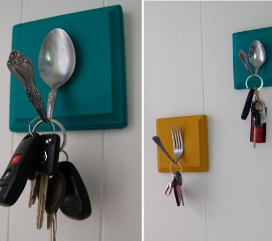 I did a bit of digging around and found this really easy approach to cutlery key racks. Also it looks like a fairly interesting decorating statement but more importantly, dead easy to make. I'm guessing that Gorilla Glue is the equivalent of Superglue or No More Nails.