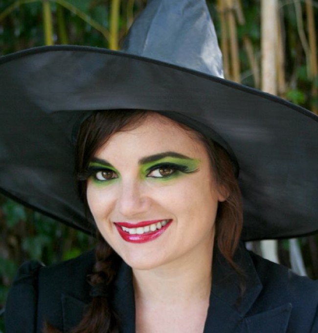 Grab a sponge and some green loose eyeshadow. Dab your whole face until you are satisfied. You can be a pretty witch and apply a lick of black lipgloss, fake lashes and cat-flick of liquid eyeliner OR rub some of that eyeshadow on rice crispies and use lash adhesive to glue on these make-shift warts.