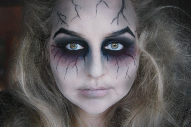 Simply make your face as pale or pure white as you can. Grab a dark grey or black eyeshadow and go in at the hollows of your cheeks, around your hairline, jawline and down the bridge and tip of your nose. Grab a black eyeliner and draw on lines for the mouth.