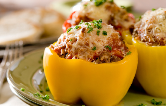 - Mix your Tomato Puree into your Mince Mix and stuff into each Pepper.