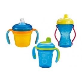 The Fisher Price Sippy Cup Set consists of a Baby's First Sippy Cup and is suitable for age 4M+ (5oz/147ml), a Two Grip Travel Sippy Cup suitable for age 6M+ (8oz/236ml) and a 3 Flow Sippy Cup suitable for age 6M+ (8oz/236ml).