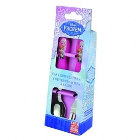 This Disney Frozen Elsa & Anna Easy Grip Cutlery Set includes a Fork and a Spoon. The handles are pink plastic with a Frozen themed design on each. These are dishwasher safe, which is handy.