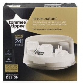 This is a compact steriliser that is easy to use, and will sterilise up to 4 bottles in 4 to 8 minutes. They will stay sterile for up to 24 hours if the lid remains closed, and it's BPA free. The new compact design means it takes up less space than a bulky electric one too.