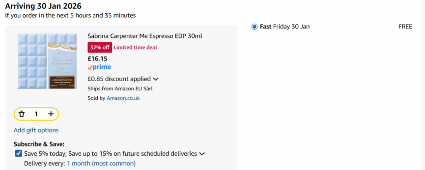 If you're a fan of Sabrina Carpenter's Sweet Tooth fragrance range, then this is a bargain at Amazon that you won't want to miss! You can currently get the Sabrina Carpenter Me Espresso EDP 30ml for just £16.15 on a limited time deal when you opt to subscribe and save. It's still selling for £24.99 at Boots so this is a bargain.