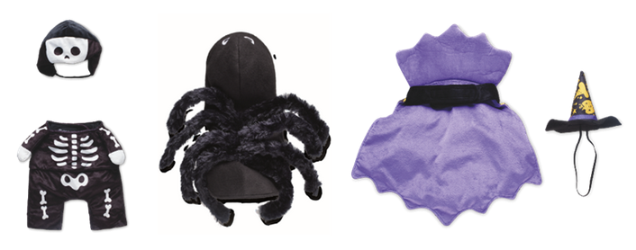 The spider costume offers a delightfully creepy crawly transformation with eight furry legs, while both the skeleton and witch options include matching hats for pups.