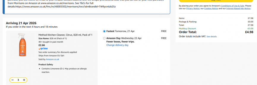 This is an absolute bargain if you like the Method Daily Kitchen Cleaner in the clementine scent. Amazon have it for only £2.66 instead of £5.99 but they also have an offer on where you can save another £3 when you buy three. So at the basket the price comes to only £4.98 for 3 bottles!