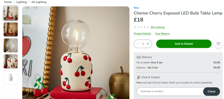 Bring a pop of personality with the Cherise Cherry Exposed LED Bulb Table Lamp, new in at Dunelm. It's priced at £18 and is definitely eye-catching.