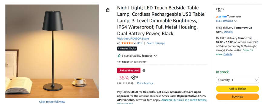I've been on the lookout for one of these LED Touch Bedside Table Lamps to put in my daughters room. As they are battery operated I thought they would be worth investing in incase there's a power cut. I just grabbed a few more from Amazon as they are down to only £8.05 on a limited time deal, plus there's free Prime delivery.