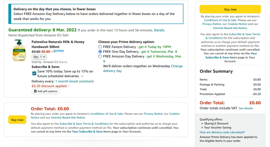 We can do better than that though, opt to subscribe and save and it's just 72p however if you tick the 10% off voucher on the aquarium hand wash the price drops to only 64p.There's a 15% off voucher on the milk and honey hand was making it only 60p!