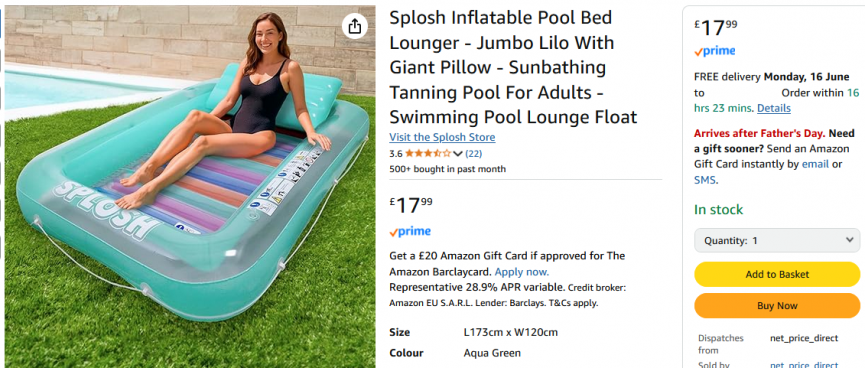 My daughter has been talking about getting one of these Inflatable Pool Loungers for the summer but when I looked they were around £40-£50. However I've just ordered this bargain from Amaozn seller net_price_direct for her, it's just £17.99!
