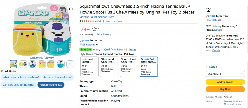 If you have a dog at home then this is an offer you won't want to miss this bargain. I've seen these Squishmallows ChewMees Pet Toys in B&M before for at least £4 each, however at Amazon you can get a pack of 2 down to only £2.82! What a bargain!