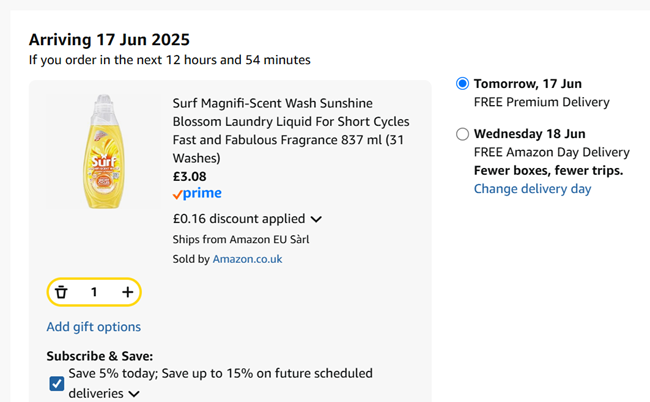 It's really easy to set up the Subscribe & Save as you just choose the frequency of your deliveries at up to 6 months apart, change the first delivery date if you wish and then order as usual. Your discount is applied automatically at the checkout. Once you've received your order you can easily amend your subscription at any time.