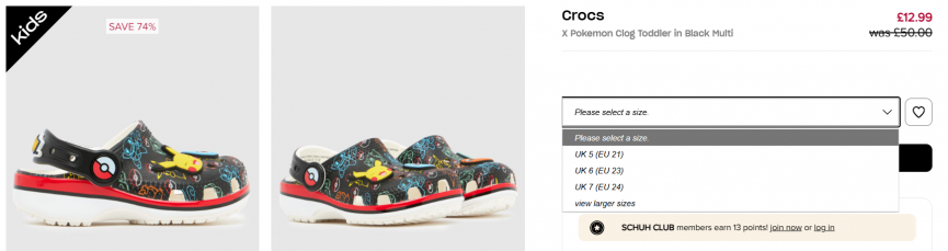 They are currently available in the sale in sizes infant 5, 6 and 7. If it's larger sizes you are looking for then you can also get these Kids Junior Pokémon Crocs Clogs* in sizes 13-2. They are more expensive however at £31.99 instead of £55.