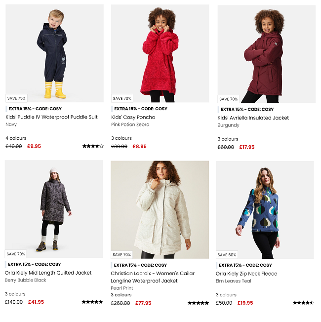The big Winter Sale at Regatta has some amazing bargains right now. Although their sale banner says 'up to 50% off' there are items with as much as 75% off, plus you can get an extra 15% off 'winter warmers' with the code COSY too!