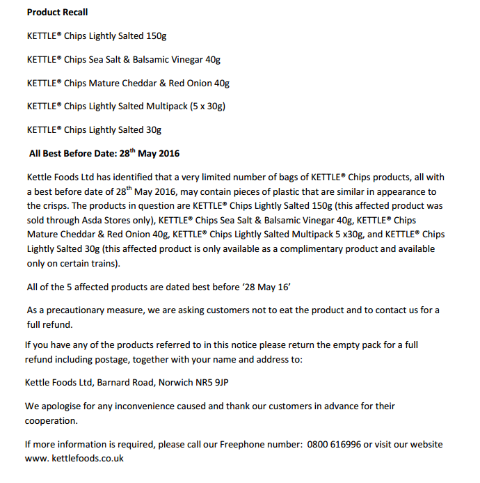 Thefood standards agency reports that bags of Kettle Chips with a 'best before' date of 28 May 2016 have been recalled "because the products may contain pieces of plastic. This means these products are a possible risk to health."