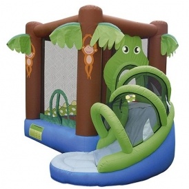 This comes with a blower included, is made from tough durable vinyl, and lots of extra details on it like the monkeys, palm trees and the crocodile.