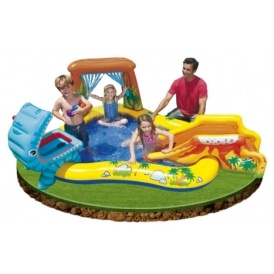 This brilliant play pool has a waterfall, a palm tree water sprayer, a slide with a landing mat for extra padding, and a ball pool.