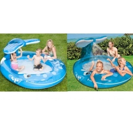 The Intex Whale Spray Pool is a paddling pool that is in the shape on a Whale. The tale curls over the pool and sprays out a shower of water.