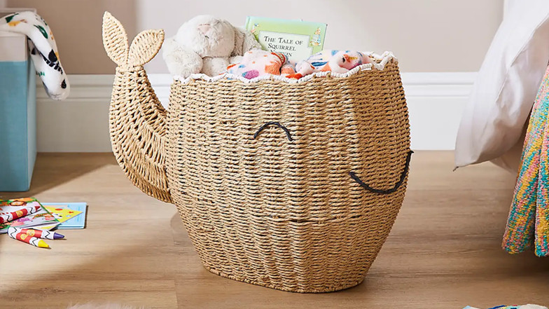 This gorgeous new Woven Whale Basket is a lovely way to keep toys, blankets, and all those little bits in one place. Handwoven with care and shaped like a friendly whale, this spacious basket brings a splash of fun to your child's room. It has a smiley face, a large tail and the inside has lots of space for kids to tidy away their toys and clutter.