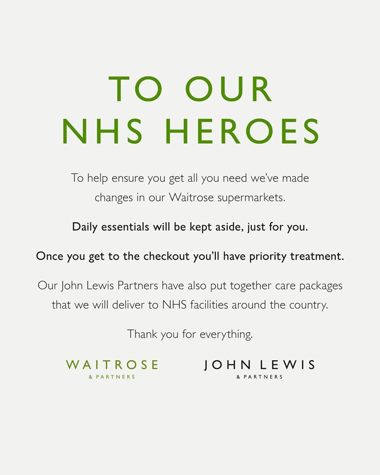 The John Lewis Partnership has also announced that from Monday 23rd March, its network of Waitrose shops will set aside a proportion of hard-to-find items exclusively for NHS staff.